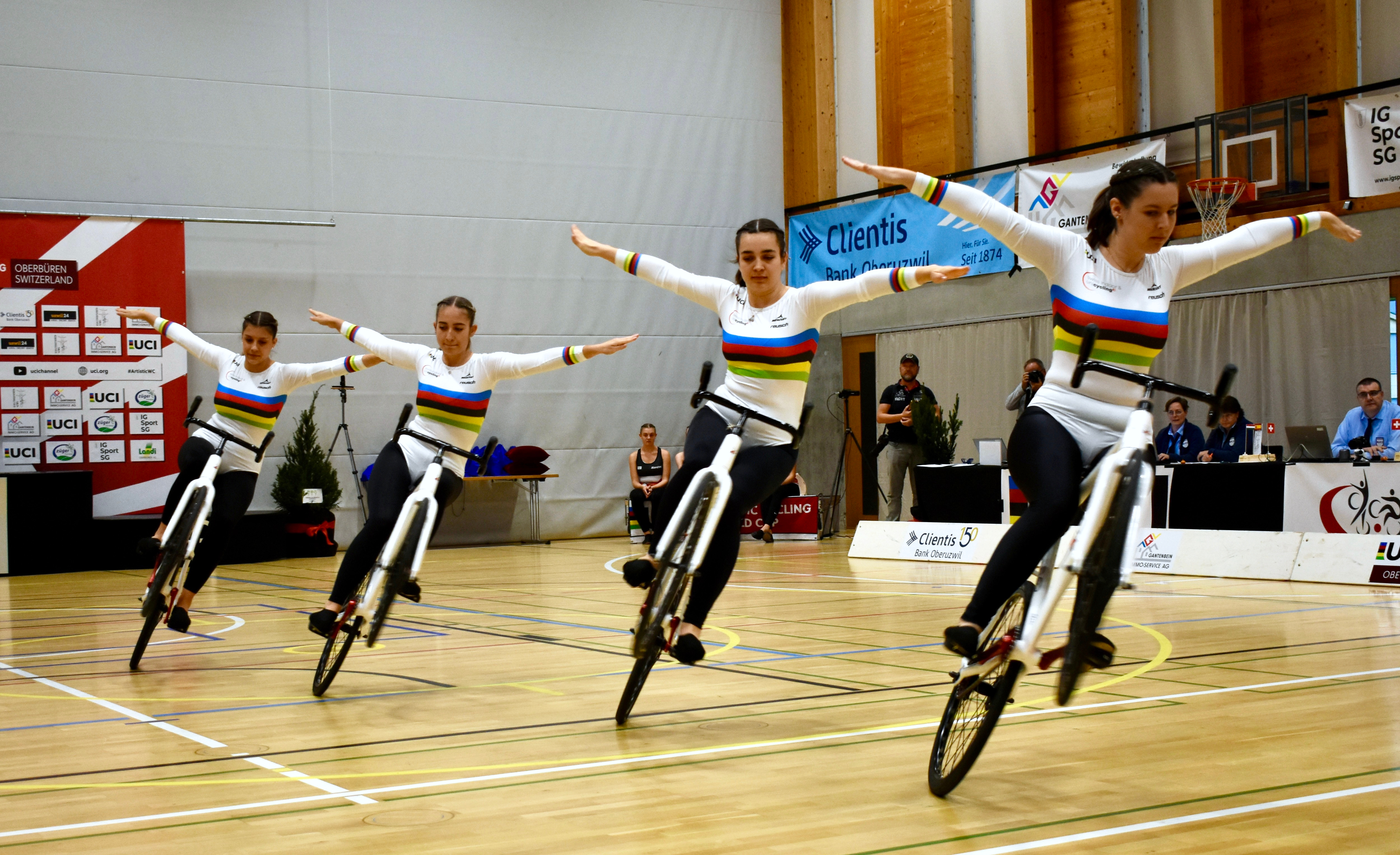 Ein emotionaler Moment war der letzte Auftritt der letztjährigen Weltmeisterinnen aus Baar im 4er-Kunstradfahren. Für Vanessa Hotz, Stefanie Moos, Flavia Schürmann und Carole Ledergerber markierte der Weltcup-Final in Oberbüren den Abschied ihrer aktiven Karriere, und sie begeisterten das Publikum ein letztes Mal mit einer eindrucksvollen Darbietung, welche all die Leidenschaft und Herzblut zeigte, die sie über die Jahre in diesen Sport investiert haben. Auf diesem Weg wünschen wir den 4 jungen Frauen alles Gute für die Zukunft und freuen uns, dass sie weiterhin dem Kunstradsport erhalten bleiben und sie ihre Erfahrungen und ihr Wissen an die nächste Generation weiterzugeben.