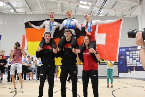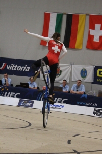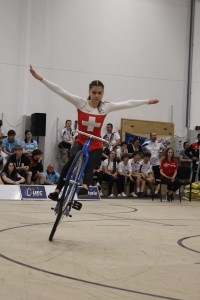 Salome Schnetzer konnte sich während der Frühlingswettkämpfe souverän für die EM qualifizieren und hatte am zweiten Wettkampftag ihren grossen Auftritt. Für die 17-jährige Jonschwilerin war es die erste Teilnahme an einer internationalen Meisterschaft. Sie reichte die dritthöchste Punktzahl ein, dementsprechend war das Ziel eine gute Kür zu zeigen und sich so gegen die Konkurrenz zu behaupten. Salome war sehr nervös vor ihrem Auftritt, konnte sich jedoch gut auf die bevorstehende Aufgabe fokussieren. So zeigte sie eine souveräne Kür und verliess das Parkett mit einem strahlenden Lächeln. Kurz darauf stand fest, Salome gewinnt die Bronzemedaille. Dies gelang zuletzt im Jahr 2021 einer Uzwiler Kunstradfahrerin. Mit dem Schweizer Team wurden am Abend die drei Silber- (4er offen, 2er Juniorinnen Kunstrad, 2er Juniorinnen Radball) und zwei Bronzemedaillen (2er offen und Salome) gefeiert